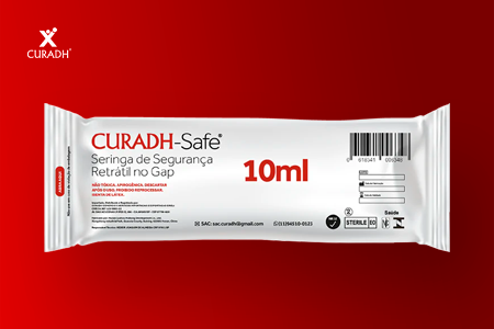 A Curadh Com e Serv Imp e Exp apresenta a seringa com dispositivo de segurança retrátil NO GAP e conexão Luer Lock, desenvolvida para garantir maior segurança ao paciente e ao profissional de saúde, em conformidade com a NR 32 para o uso de materiais perfurocortantes com proteção.